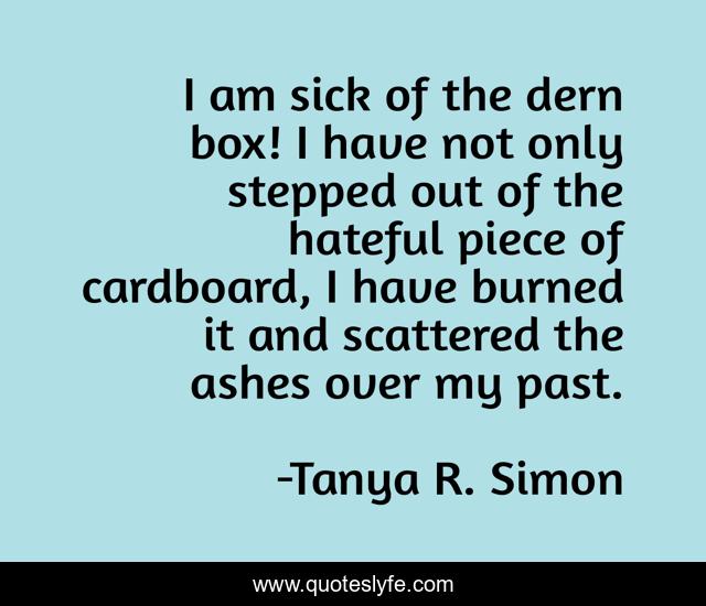 This page presents the quote "I am sick of the dern box! I have not only stepped out of the hateful piece of cardboard, I have burned it and scattered the ashes over my past.". Author of this quote is Tanya R. Simon. This quote is about past, ashes, life, the-box,.