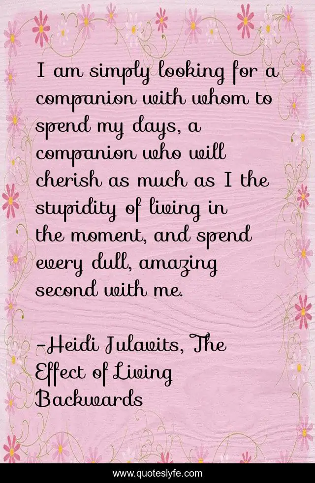 This page presents the quote "I am simply looking for a companion with whom to spend my days, a companion who will cherish as much as I the stupidity of living in the moment, and spend every dull, amazing second with me.". Author of this quote is Heidi Julavits, The Effect of Living Backwards. This quote is about love, mortality, affection,.