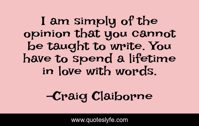 This page presents the quote "I am simply of the opinion that you cannot be taught to write. You have to spend a lifetime in love with words.". Author of this quote is Craig Claiborne. This quote is about on-writing, words, writing,.