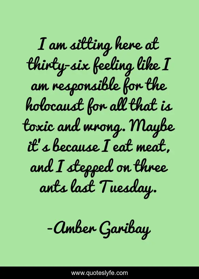 This page presents the quote "I am sitting here at thirty-six feeling like I am responsible for the holocaust for all that is toxic and wrong. Maybe it’s because I eat meat, and I stepped on three ants last Tuesday.". Author of this quote is Amber Garibay. This quote is about feelings-of-weakness, meat, tuesday, responsible, holocaust, wrong, guilt, karma, toxic,.