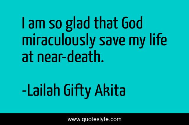 This page presents the quote "I am so glad that God miraculously save my life at near-death.". Author of this quote is Lailah Gifty Akita. This quote is about miracles, near-death-experiences, life, life-experience, life-philosophy, near-death, miracle, near, life-and-death,.