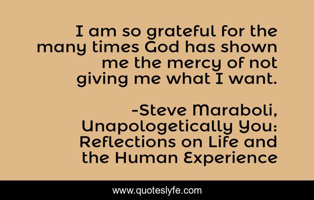 This page presents the quote "I am so grateful for the many times God has shown me the mercy of not giving me what I want.". Author of this quote is Steve Maraboli, Unapologetically You: Reflections on Life and the Human Experience. This quote is about gratitude, mercy, life, god, grateful, happiness,.