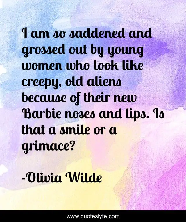 This page presents the quote "I am so saddened and grossed out by young women who look like creepy, old aliens because of their new Barbie noses and lips. Is that a smile or a grimace?". Author of this quote is Olivia Wilde. This quote is about look, women,.