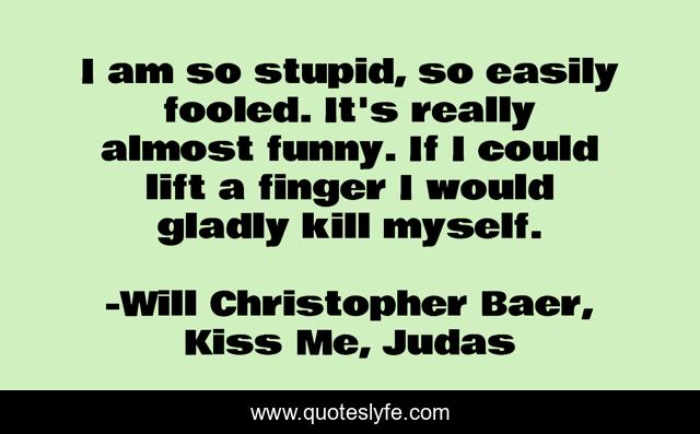 This page presents the quote "I am so stupid, so easily fooled. It's really almost funny. If I could lift a finger I would gladly kill myself.". Author of this quote is Will Christopher Baer, Kiss Me, Judas. This quote is about stupidity, suicide, humor,.