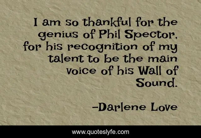 This page presents the quote "I am so thankful for the genius of Phil Spector, for his recognition of my talent to be the main voice of his Wall of Sound.". Author of this quote is Darlene Love. This quote is about genius, talent,.