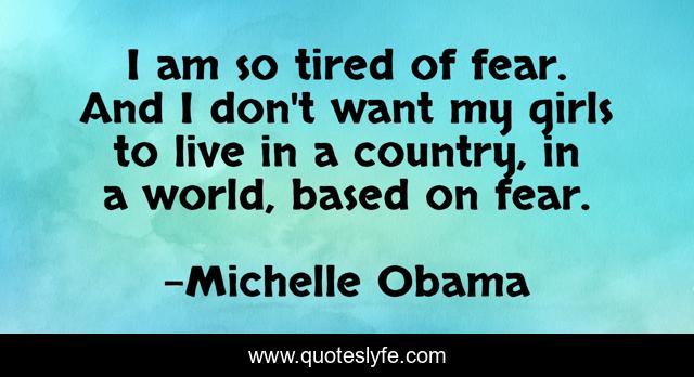 This page presents the quote "I am so tired of fear. And I don't want my girls to live in a country, in a world, based on fear.". Author of this quote is Michelle Obama. This quote is about world, tired,.