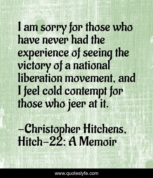 This page presents the quote "I am sorry for those who have never had the experience of seeing the victory of a national liberation movement, and I feel cold contempt for those who jeer at it.". Author of this quote is Christopher Hitchens, Hitch-22: A Memoir. This quote is about iraq-war, antiwar, liberty, liberation, iraq, 2003-invasion-of-iraq,.