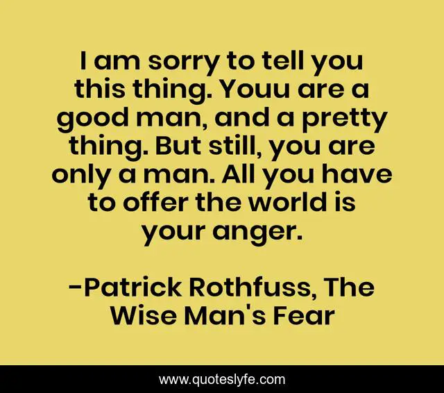 This page presents the quote "I am sorry to tell you this thing. Youu are a good man, and a pretty thing. But still, you are only a man. All you have to offer the world is your anger.". Author of this quote is Patrick Rothfuss, The Wise Man's Fear. This quote is about kvothe, love, men, penthe, anger, affection, man,.