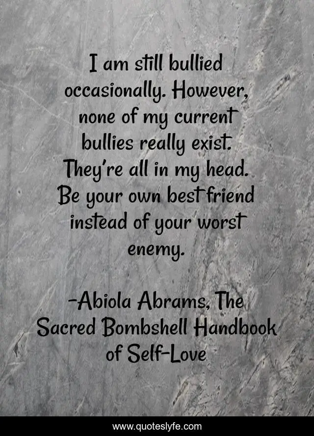 This page presents the quote "I am still bullied occasionally. However, none of my current bullies really exist. They’re all in my head. Be your own best friend instead of your worst enemy.". Author of this quote is Abiola Abrams, The Sacred Bombshell Handbook of Self-Love. This quote is about motivation, gremlins, bullies, self-love, self-hate, bullying, self-regard, fear-voice, anger,.