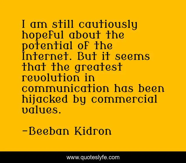 This page presents the quote "I am still cautiously hopeful about the potential of the Internet. But it seems that the greatest revolution in communication has been hijacked by commercial values.". Author of this quote is Beeban Kidron. This quote is about greatest, internet,.