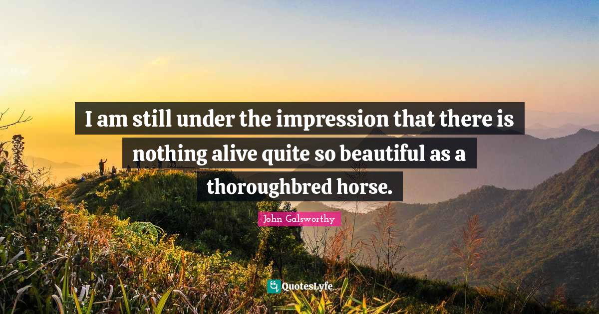This page presents the quote "I am still under the impression that there is nothing alive quite so beautiful as a thoroughbred horse.". Author of this quote is John Galsworthy. This quote is about impression, beautiful, horse, alive, inspiration,.