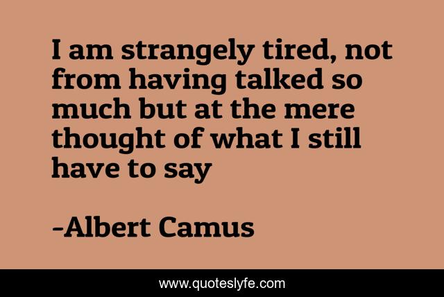 This page presents the quote "I am strangely tired, not from having talked so much but at the mere thought of what I still have to say". Author of this quote is Albert Camus. This quote is about human-nature, life, philosophy,.