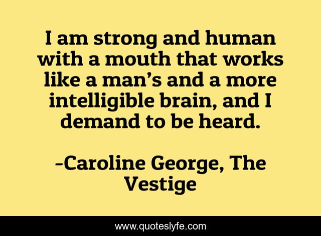 This page presents the quote "I am strong and human with a mouth that works like a man’s and a more intelligible brain, and I demand to be heard.". Author of this quote is Caroline George, The Vestige. This quote is about speaking-out, empowerment, feminist, women-s-rights, speaking-up, human, speaking-truths, strong, feminism,.