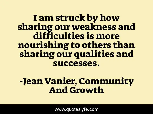 This page presents the quote "I am struck by how sharing our weakness and difficulties is more nourishing to others than sharing our qualities and successes.". Author of this quote is Jean Vanier, Community And Growth. This quote is about failure, success, weakness,.