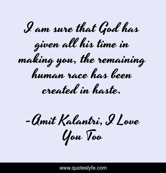 This page presents the quote "I am sure that God has given all his time in making you, the remaining human race has been created in haste.". Author of this quote is Amit Kalantri, I Love You Too. This quote is about beautiful, flirty, lovers, love, amit-kalantri-writer, beauty, amit-kalantri, pick-up-lines, love-sayings,.