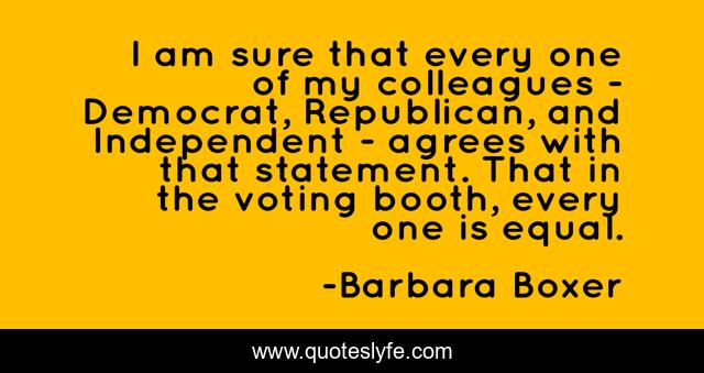 This page presents the quote "I am sure that every one of my colleagues - Democrat, Republican, and Independent - agrees with that statement. That in the voting booth, every one is equal.". Author of this quote is Barbara Boxer. This quote is about colleagues, voting,.