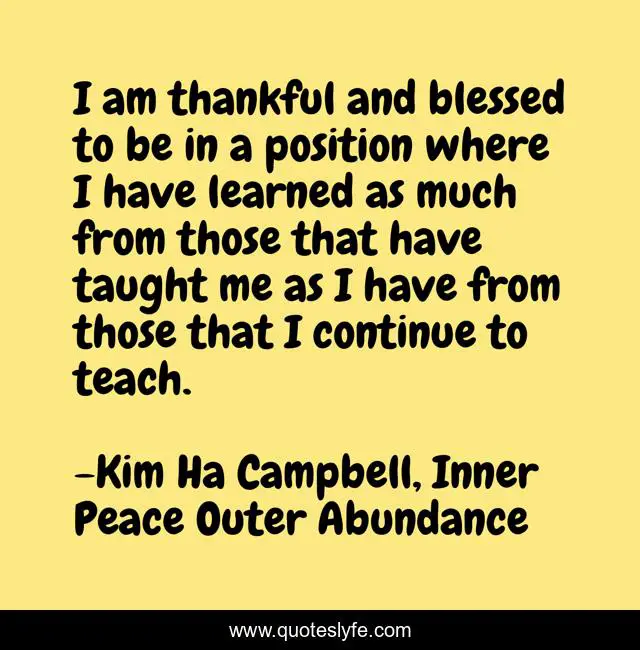 This page presents the quote "I am thankful and blessed to be in a position where I have learned as much from those that have taught me as I have from those that I continue to teach.". Author of this quote is Kim Ha Campbell, Inner Peace Outer Abundance. This quote is about inner-peace-outer-abundance, blessed-life, ipoa, growth-mindset, kim-ha-campbell, learning, thankfulness, teaching,.