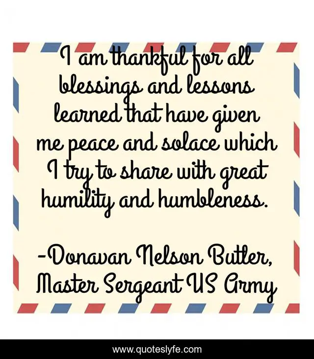 This page presents the quote "I am thankful for all blessings and lessons learned that have given me peace and solace which I try to share with great humility and humbleness.". Author of this quote is Donavan Nelson Butler, Master Sergeant US Army. This quote is about humbleness, blessings, solace, humility,.