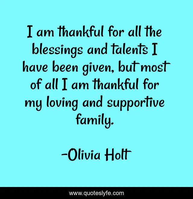 This page presents the quote "I am thankful for all the blessings and talents I have been given, but most of all I am thankful for my loving and supportive family.". Author of this quote is Olivia Holt. This quote is about thankful, blessings,.