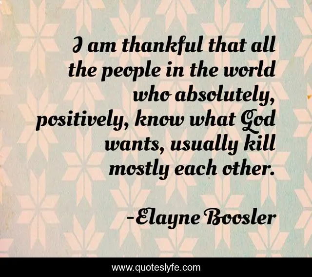This page presents the quote "I am thankful that all the people in the world who absolutely, positively, know what God wants, usually kill mostly each other.". Author of this quote is Elayne Boosler. This quote is about god, world,.