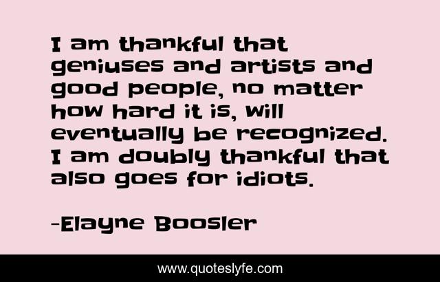 This page presents the quote "I am thankful that geniuses and artists and good people, no matter how hard it is, will eventually be recognized. I am doubly thankful that also goes for idiots.". Author of this quote is Elayne Boosler. This quote is about good, good people,.