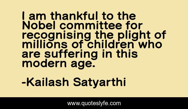 This page presents the quote "I am thankful to the Nobel committee for recognising the plight of millions of children who are suffering in this modern age.". Author of this quote is Kailash Satyarthi. This quote is about age, children,.