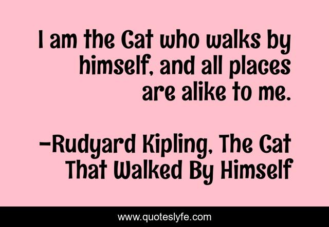 This page presents the quote "I am the Cat who walks by himself, and all places are alike to me.". Author of this quote is Rudyard Kipling, The Cat That Walked By Himself. This quote is about pride, solitude, cats, self-containment,.