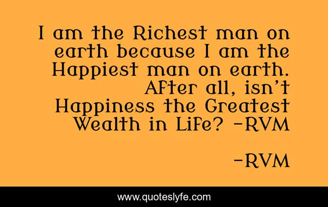 This page presents the quote "I am the Richest man on earth because I am the Happiest man on earth. After all, isn’t Happiness the Greatest Wealth in Life? -RVM". Author of this quote is RVM. This quote is about motivation, inspiration,.