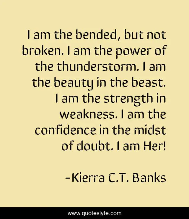 This page presents the quote "I am the bended, but not broken. I am the power of the thunderstorm. I am the beauty in the beast. I am the strength in weakness. I am the confidence in the midst of doubt. I am Her!". Author of this quote is Kierra C.T. Banks. This quote is about life, strength, power, beauty, liberation, strength-of-character, trials, endurance, peace,.