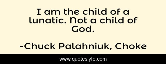 This page presents the quote "I am the child of a lunatic. Not a child of God.". Author of this quote is Chuck Palahniuk, Choke. This quote is about god, lunatic, child,.