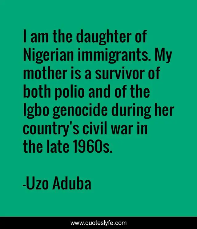 This page presents the quote "I am the daughter of Nigerian immigrants. My mother is a survivor of both polio and of the Igbo genocide during her country's civil war in the late 1960s.". Author of this quote is Uzo Aduba. This quote is about daughter, mother,.