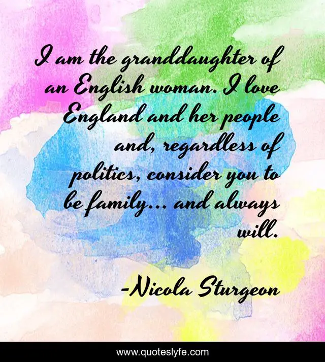 This page presents the quote "I am the granddaughter of an English woman. I love England and her people and, regardless of politics, consider you to be family... and always will.". Author of this quote is Nicola Sturgeon. This quote is about love, family, affection,.