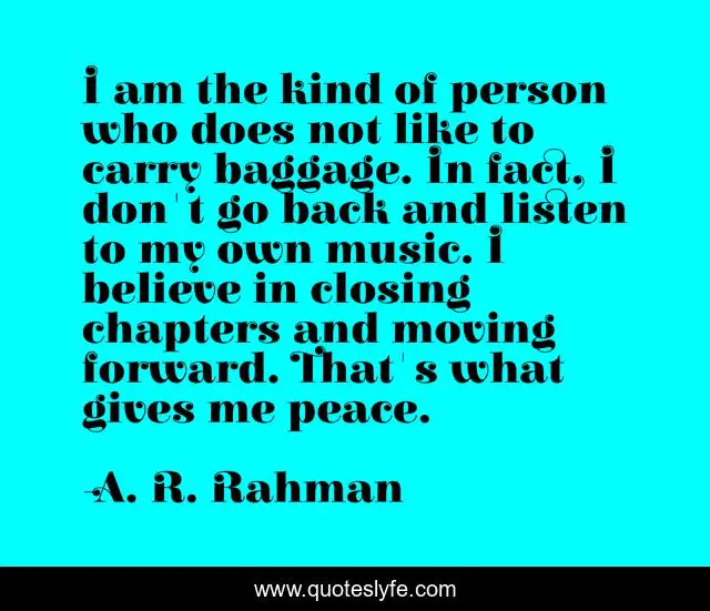This page presents the quote "I am the kind of person who does not like to carry baggage. In fact, I don't go back and listen to my own music. I believe in closing chapters and moving forward. That's what gives me peace.". Author of this quote is A. R. Rahman. This quote is about moving forward, music,.