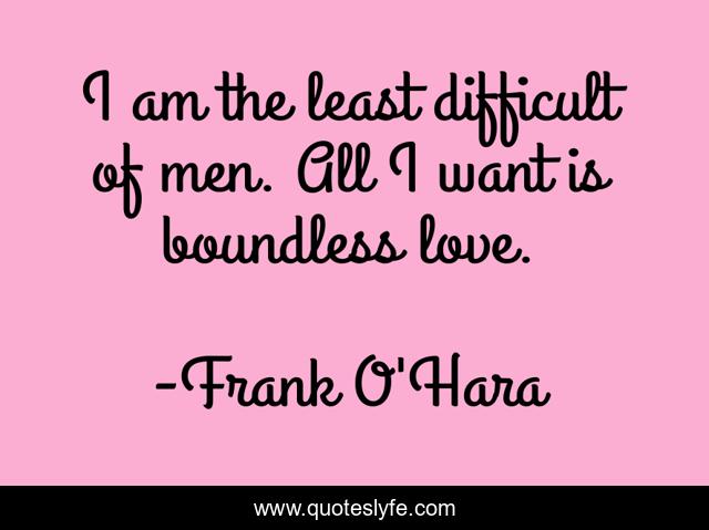 This page presents the quote "I am the least difficult of men. All I want is boundless love.". Author of this quote is Frank O'Hara. This quote is about frank, men, love, affection, o-hara,.