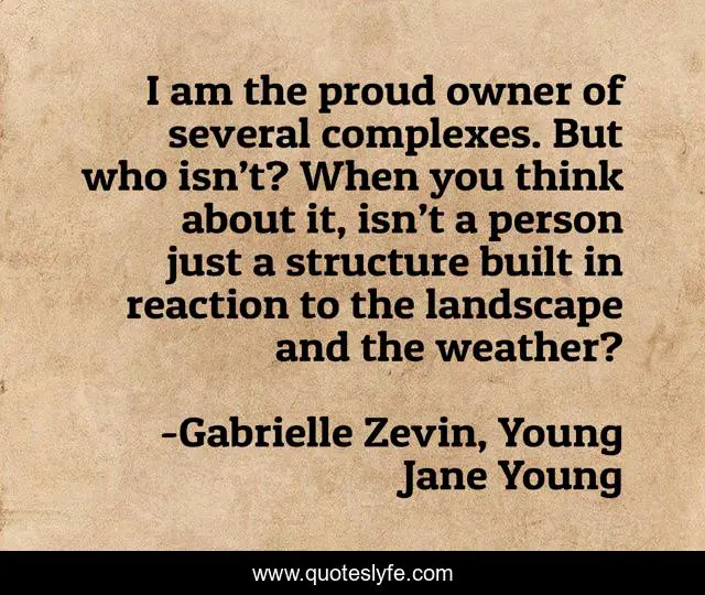 This page presents the quote "I am the proud owner of several complexes. But who isn’t? When you think about it, isn’t a person just a structure built in reaction to the landscape and the weather?". Author of this quote is Gabrielle Zevin, Young Jane Young. This quote is about complex, personality,.