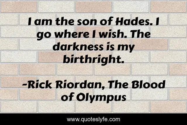 This page presents the quote "I am the son of Hades. I go where I wish. The darkness is my birthright.". Author of this quote is Rick Riordan, The Blood of Olympus. This quote is about nico-di-angelo, darkness, son-of-hades,.