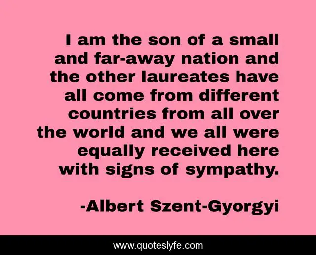 This page presents the quote "I am the son of a small and far-away nation and the other laureates have all come from different countries from all over the world and we all were equally received here with signs of sympathy.". Author of this quote is Albert Szent-Gyorgyi. This quote is about world, son,.