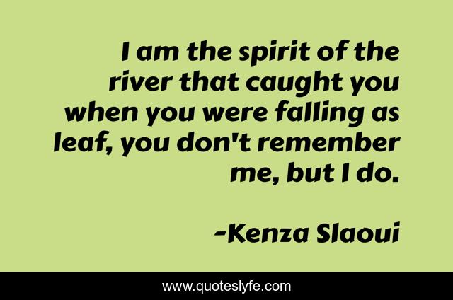 This page presents the quote "I am the spirit of the river that caught you when you were falling as leaf, you don't remember me, but I do.". Author of this quote is Kenza Slaoui. .