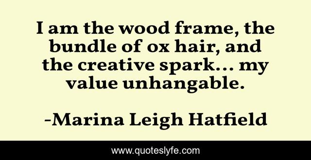 This page presents the quote "I am the wood frame, the bundle of ox hair, and the creative spark... my value unhangable.". Author of this quote is Marina Leigh Hatfield. This quote is about creativity, painting, value, artist,.