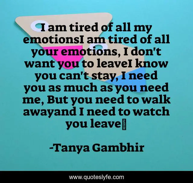 This page presents the quote "I am tired of all my emotionsI am tired of all your emotions, I don't want you to leaveI know you can't stay, I need you as much as you need me, But you need to walk awayand I need to watch you leave~". Author of this quote is Tanya Gambhir. This quote is about relationships, breakup, life-and-living, quotes,.