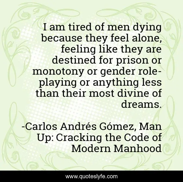This page presents the quote "I am tired of men dying because they feel alone, feeling like they are destined for prison or monotony or gender role-playing or anything less than their most divine of dreams.". Author of this quote is Carlos Andrés Gómez, Man Up: Cracking the Code of Modern Manhood. .