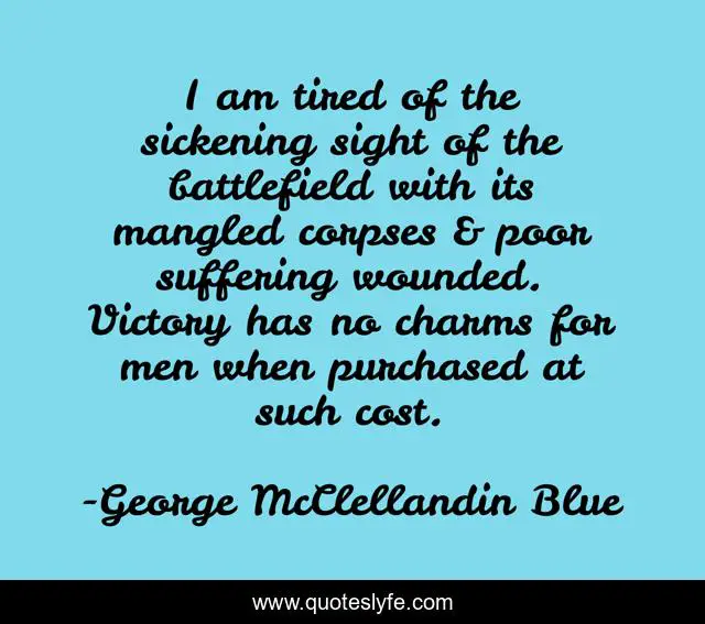 This page presents the quote "I am tired of the sickening sight of the battlefield with its mangled corpses & poor suffering wounded. Victory has no charms for men when purchased at such cost.". Author of this quote is George McClellandin Blue. This quote is about antietam, combat, gettysburg, mcclellan, union-army, civil-war, chancellorsville, medicine, military,.