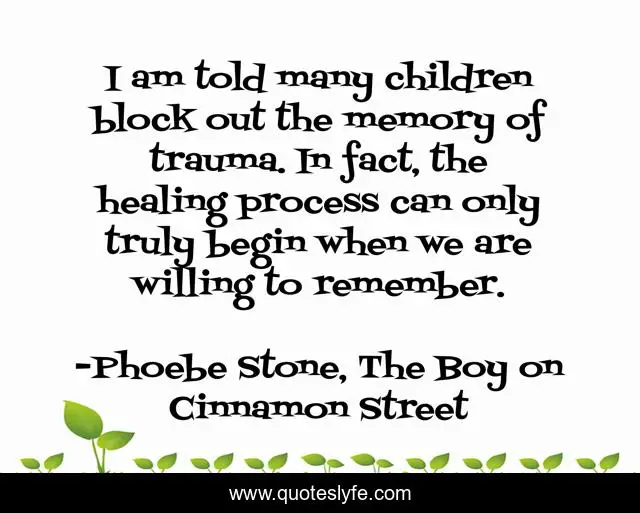 This page presents the quote "I am told many children block out the memory of trauma. In fact, the healing process can only truly begin when we are willing to remember.". Author of this quote is Phoebe Stone, The Boy on Cinnamon Street. This quote is about loss, pain, children, inspirational, enthusiasm,.