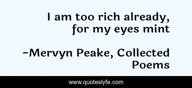 This page presents the quote "I am too rich already, for my eyes mint". Author of this quote is Mervyn Peake, Collected Poems. This quote is about beauty-in-nature, eyes, beauty, gold, riches, wealth,.