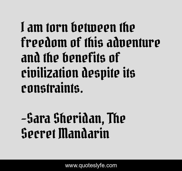This page presents the quote "I am torn between the freedom of this adventure and the benefits of civilization despite its constraints.". Author of this quote is Sara Sheridan, The Secret Mandarin. This quote is about freedom, civilization, adventure, constraints,.