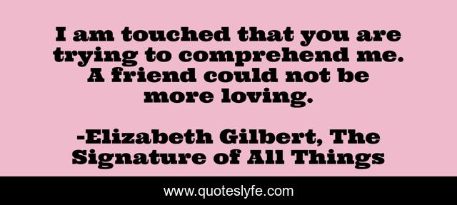 This page presents the quote "I am touched that you are trying to comprehend me. A friend could not be more loving.". Author of this quote is Elizabeth Gilbert, The Signature of All Things. This quote is about friendship, love, affection,.