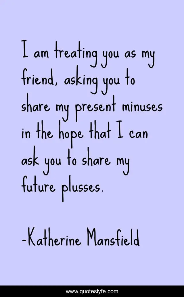 This page presents the quote "I am treating you as my friend, asking you to share my present minuses in the hope that I can ask you to share my future plusses.". Author of this quote is Katherine Mansfield. .