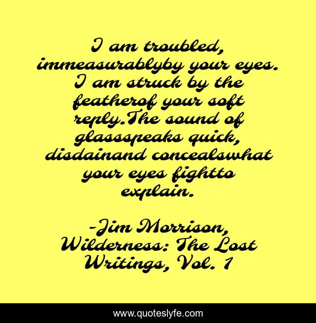 This page presents the quote "I am troubled, immeasurablyby your eyes. I am struck by the featherof your soft reply.The sound of glassspeaks quick, disdainand concealswhat your eyes fightto explain.". Author of this quote is Jim Morrison, Wilderness: The Lost Writings, Vol. 1. This quote is about love, affection,.