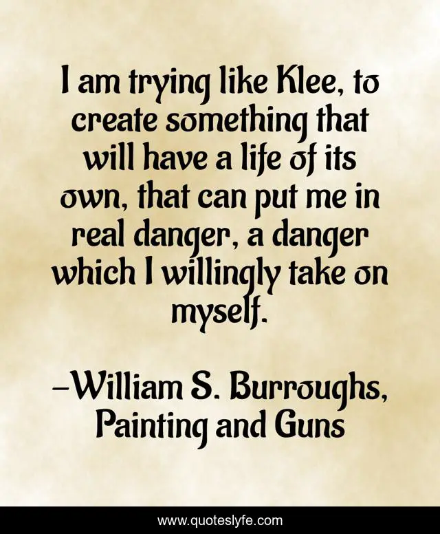 This page presents the quote "I am trying like Klee, to create something that will have a life of its own, that can put me in real danger, a danger which I willingly take on myself.". Author of this quote is William S. Burroughs, Painting and Guns. This quote is about danger, painting, guns, klee,.