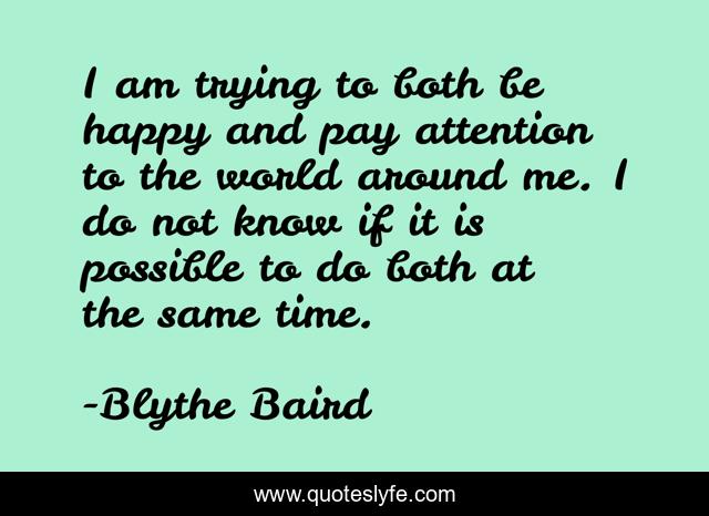 This page presents the quote "I am trying to both be happy and pay attention to the world around me. I do not know if it is possible to do both at the same time.". Author of this quote is Blythe Baird. This quote is about life, poetry,.
